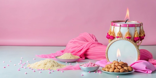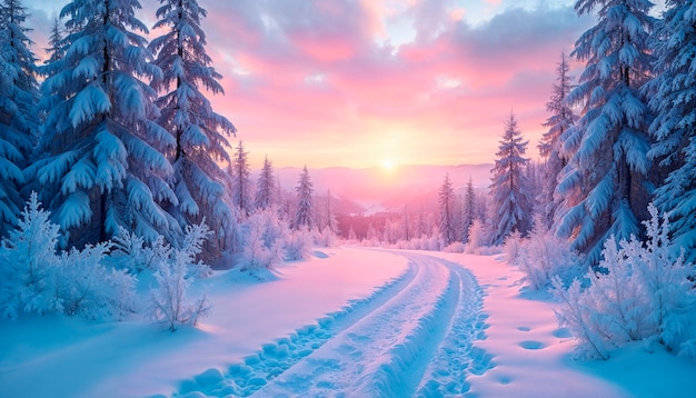 A vibrant, colorful tree with a large, fluffy pink and purple crown stands atop a mountainous landscape. The mountains in the background have a stylized, abstract shape with warm, vivid colors. A winding river flows through the foreground, adding to the fantastical, dreamlike atmosphere